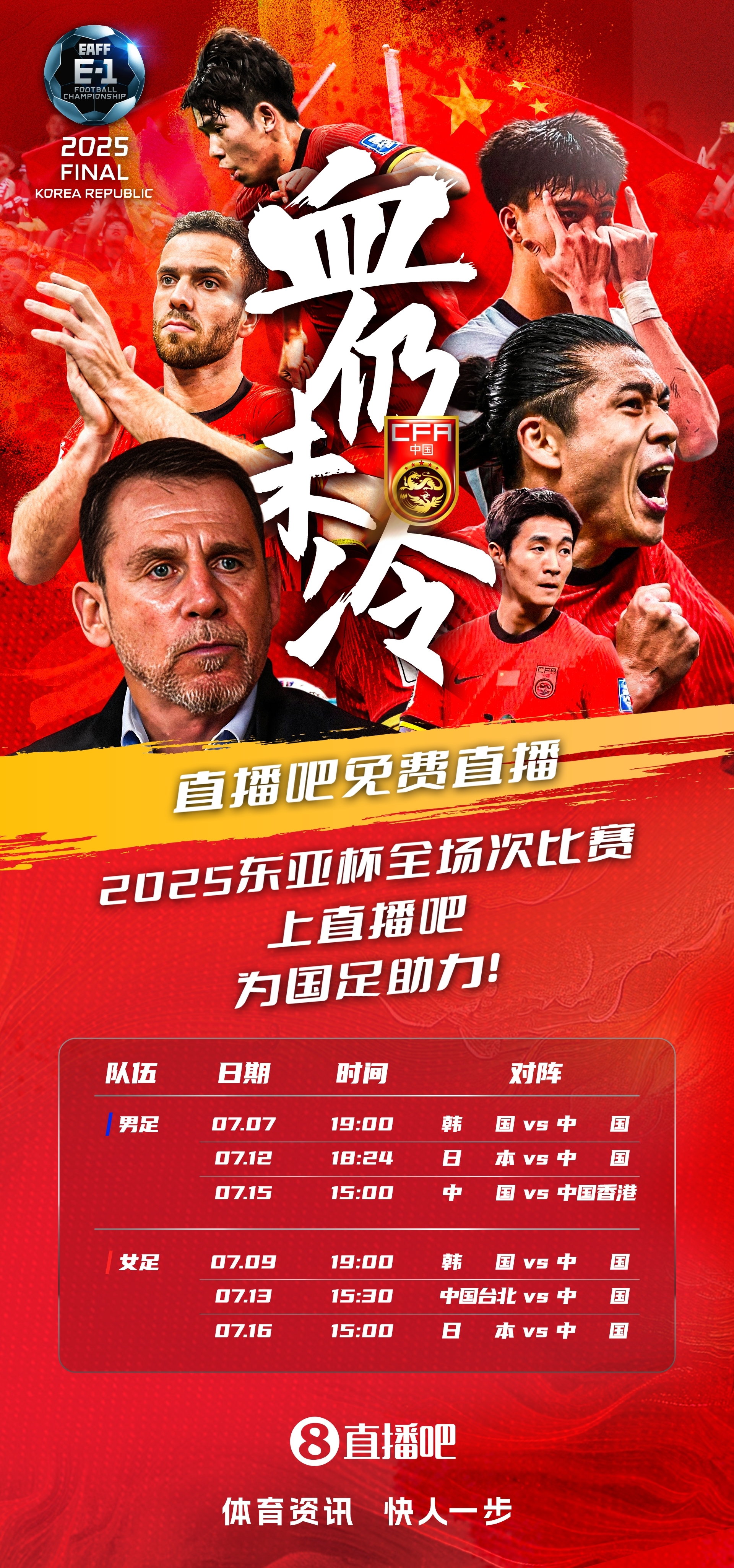 北京时间今晚19:00,2025东亚杯正式拉开帷幕,国足将在首场比赛对阵东道主韩国。作为赛事版权方,将会全程免费视频直播本届所有男足/女足东亚杯赛事。今晚久尔杰维奇的带队首秀,将由于鑫淼&杨晨带来解说。【视频直播间:国足vs韩国,于鑫淼/杨晨解说】。